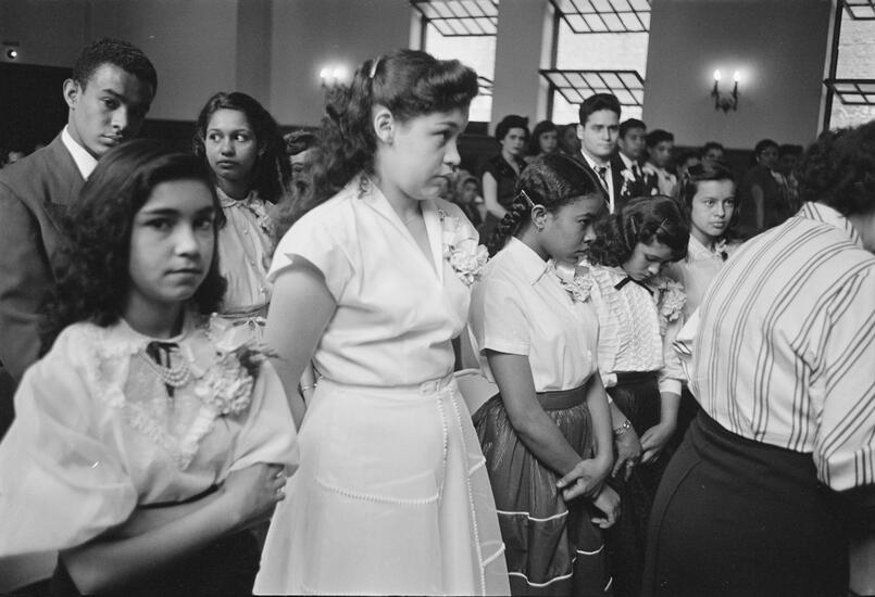 Photographs of Puerto Rican families in the city. Depicts children in an art class; a block party; a group of young men sitting on the sidewalk playing guitar; church services; people gathered for a wedding; children playing in fire hydrant water, streets, swimming pools, and alleys; grocers and street vendors selling food; and families in their homes. Also depicts a family de-boarding an airplane, waiting to collect their luggage, and getting in a taxicab at the airport.