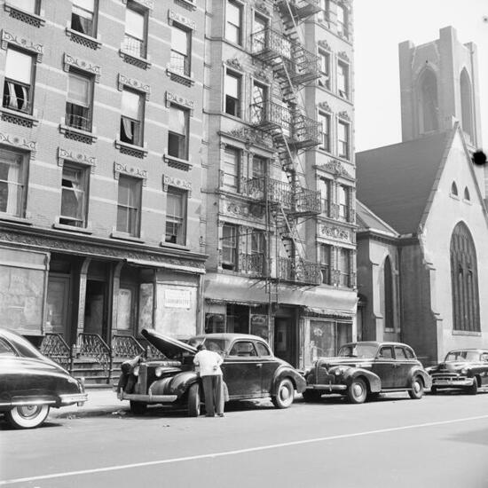 Photographs of Puerto Rican families in the city. Depicts children in an art class; a block party; a group of young men sitting on the sidewalk playing guitar; church services; people gathered for a wedding; children playing in fire hydrant water, streets, swimming pools, and alleys; grocers and street vendors selling food; and families in their homes. Also depicts a family de-boarding an airplane, waiting to collect their luggage, and getting in a taxicab at the airport.