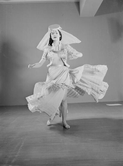 Photographs of Christine Ayers modeling costumes designed by Miles White.