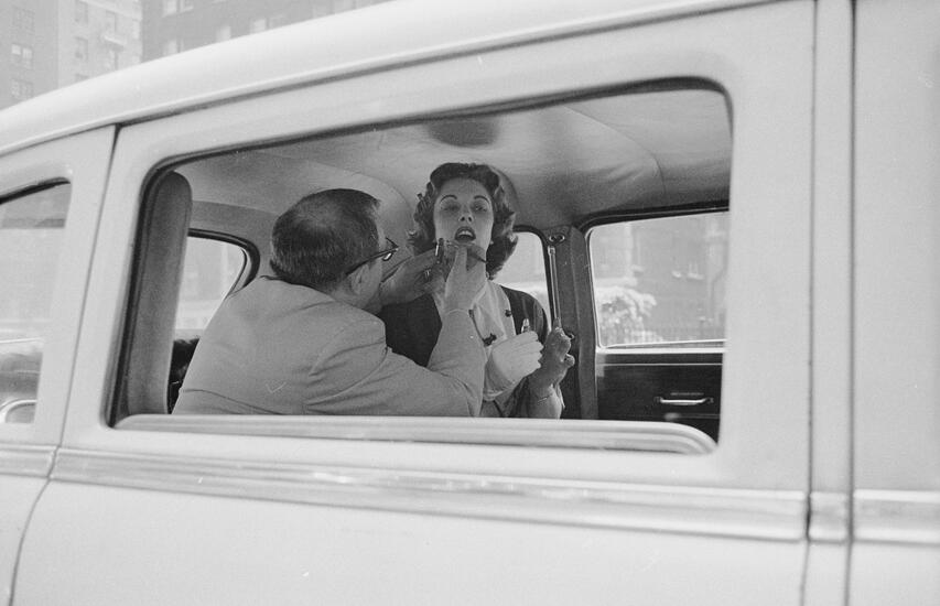 Photographs of a man and woman sitting the the back of a taxi. The man fixes the woman's hair as they ride.