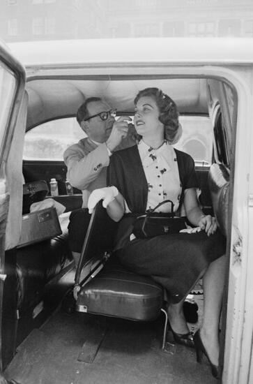 Photographs of a man and woman sitting the the back of a taxi. The man fixes the woman's hair as they ride.