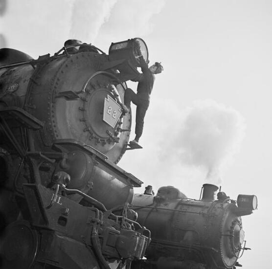 Photographs of women at work in jobs vacated by men fighting in World War II. Women are depicted driving taxis, delivering mail, bartending, operating elevators, barbering, working on a train engine, pinsetting at a bowling alley, and working for the fire department.