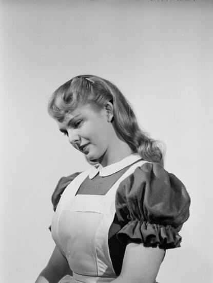 Portraits of actress Bambi Linn sitting and wearing a pinafore. In one photograph there is a man standing behind her, fixing her hair.