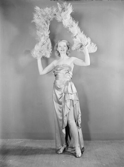 Photographs of Christine Ayers modeling costumes designed by Miles White.
