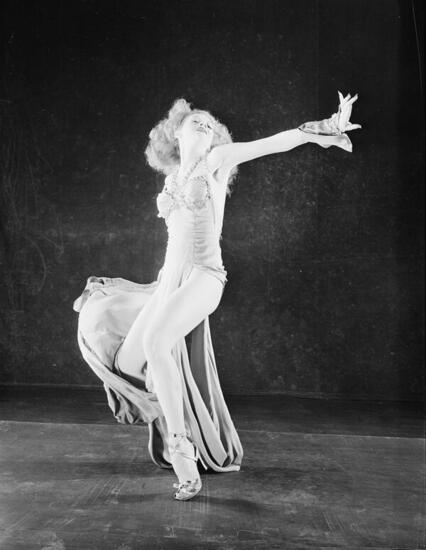 Photographs of Christine Ayers modeling costumes designed by Miles White.