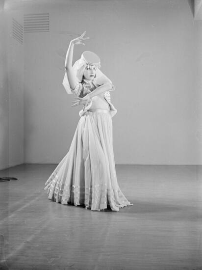 Photographs of Christine Ayers modeling costumes designed by Miles White.