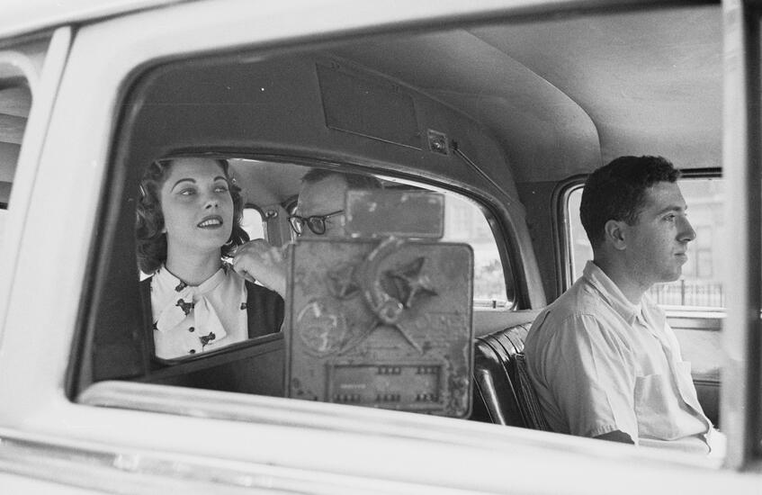 Photographs of a man and woman sitting the the back of a taxi. The man fixes the woman's hair as they ride.