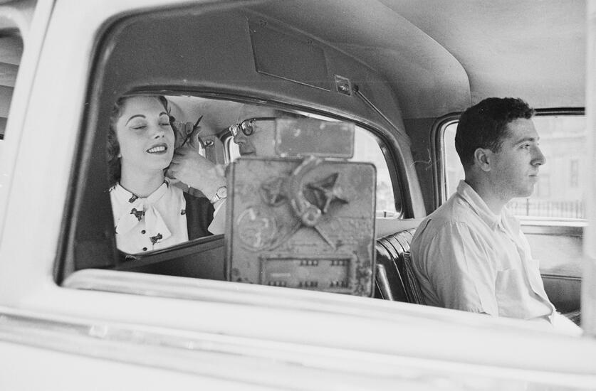 Photographs of a man and woman sitting the the back of a taxi. The man fixes the woman's hair as they ride.