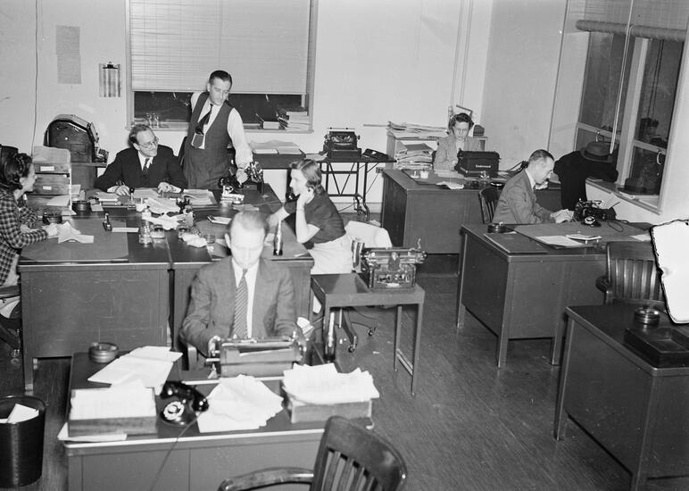 Photographs from the 1939-1940 New York World's Fair. Depicts visitors at art exhibits, eating hot dogs, and sitting on benches. Also includes an aerial view of the fair and interior office scenes.
