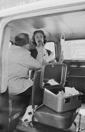 Photographs of a man and woman sitting the the back of a taxi. The man fixes the woman's hair as they ride.