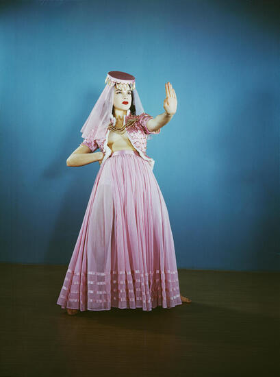 Photographs of female dancers and chorus girls modeling elaborate costumes designed by Miles White. They are a variety of bright colors and styles, and many feature matching hats or headpieces. Includes costumes for "Dream With Music."