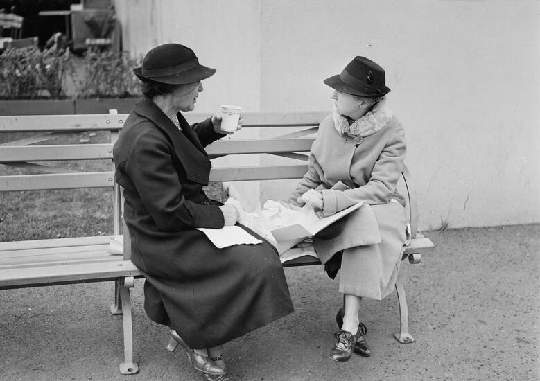 Photographs from the 1939-1940 New York World's Fair. Depicts visitors at art exhibits, eating hot dogs, and sitting on benches. Also includes an aerial view of the fair and interior office scenes.