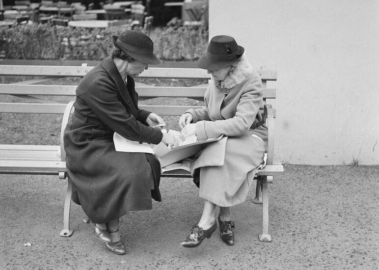 Photographs from the 1939-1940 New York World's Fair. Depicts visitors at art exhibits, eating hot dogs, and sitting on benches. Also includes an aerial view of the fair and interior office scenes.