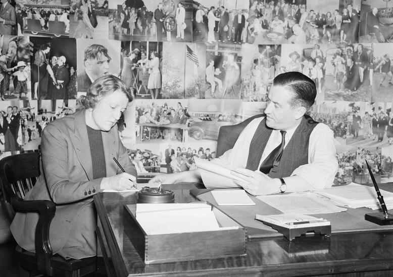 Photographs from the 1939-1940 New York World's Fair. Depicts visitors at art exhibits, eating hot dogs, and sitting on benches. Also includes an aerial view of the fair and interior office scenes.
