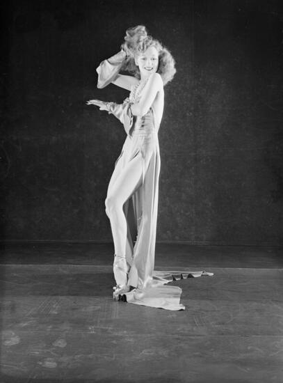 Photographs of Christine Ayers modeling costumes designed by Miles White.