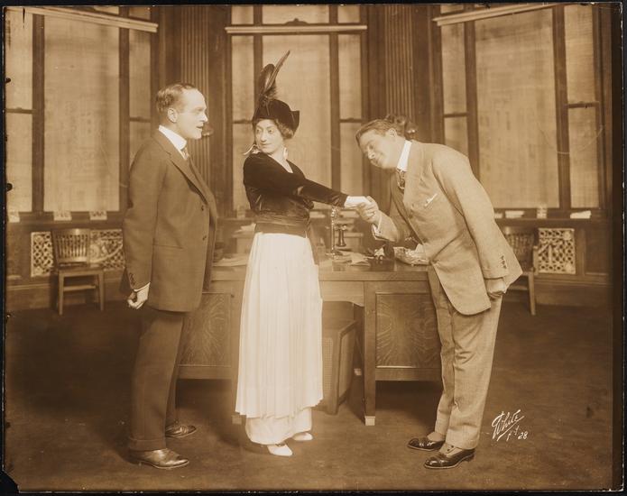 [Walter Gilbert as Joseph Heath, Eleanor Audley as Elinore Payne and George M. Cohan as Parker in "Pigeons and People".]