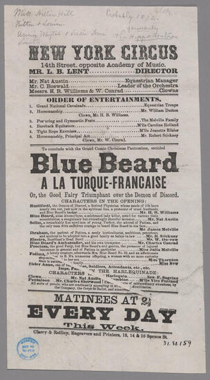 The entirely new and decidedly original Christmas pantomime, "Harlequin Blue Beard; or, The Good Fairy Preciosa and the Bad Demon Rustifusti"