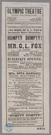 The great prophet of fun, Geo. L. Fox, the life of every household, witness his original and great comic pantomime of "Humpty Dumpty at Home", Monday, April 6, 1874