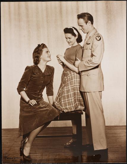[Joan Caulfield as Corliss Archer, Jessie Royce Landis as Janet Archer and Robert White as Dexter Franklin in "Kiss and Tell".]