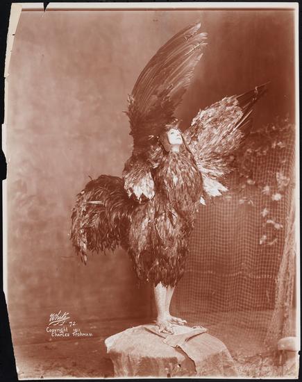 [Maude Adams adjusting an actor's costume for "Chantecler".]