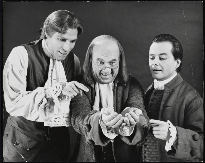[Unidentified actor in the role of Thomas Jefferson, Howard Da Silva as Benjamin Franklin and William Daniels as John Adams in "1776".]