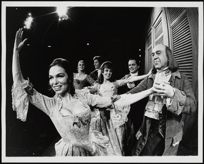 [Unidentified actor in the role of Thomas Jefferson, Howard Da Silva as Benjamin Franklin and William Daniels as John Adams in "1776".]