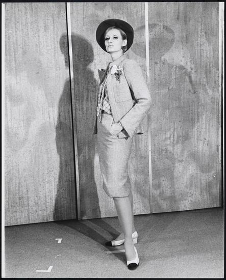 [Katharine Hepburn as Coco Chanel with ensemble in "Coco".]