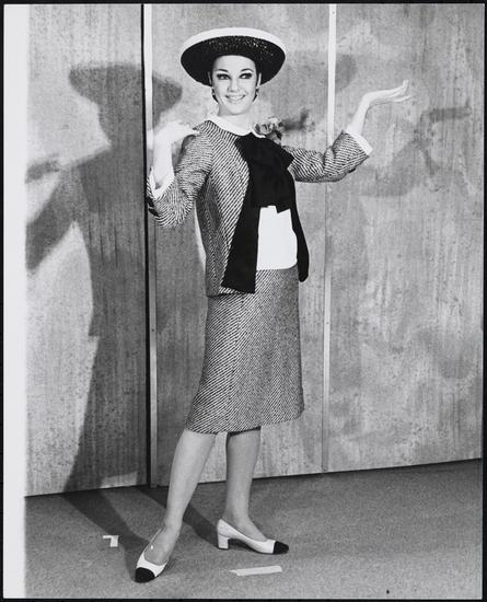 [Katharine Hepburn as Coco Chanel with ensemble in "Coco".]