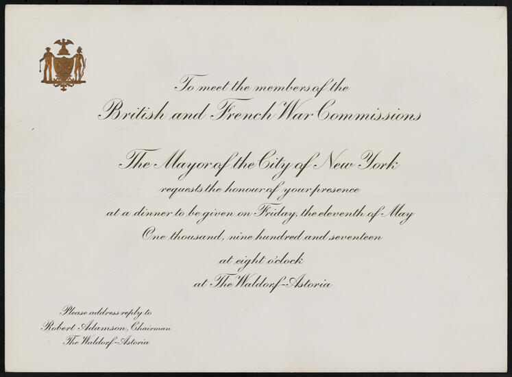 To meet the members of the British and French War Commissions the Mayor of the City of New York requests the honour of your presence
