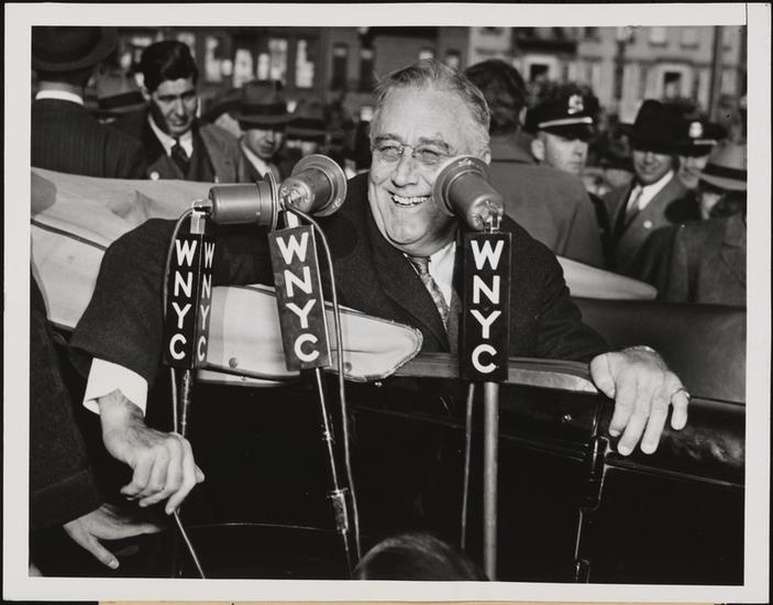 [Franklin D. Roosevelt speaking into radio microphones.]