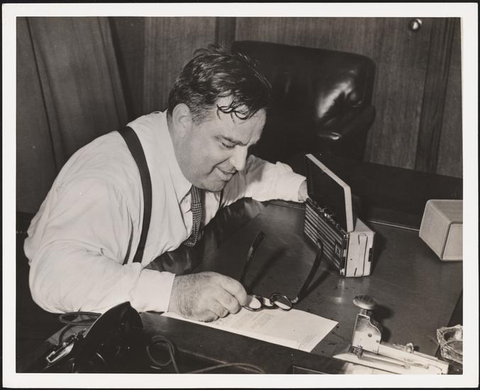 Laguardia, Mayor [Mayor La Guardia putting on his jacket in an office.]