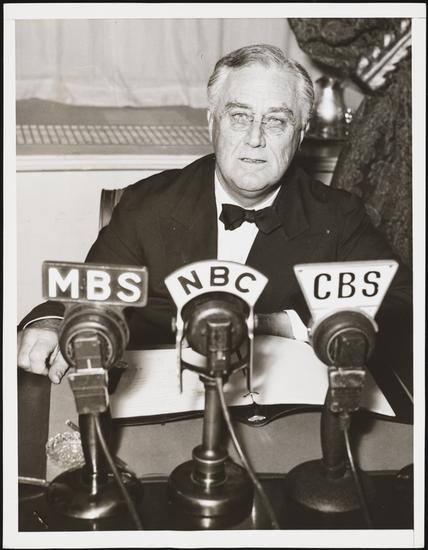 [Franklin D. Roosevelt giving a Columbus Day radio address.]