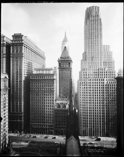 [Trinity Church opposite Wall Street, against Irving Trust Company Building.]