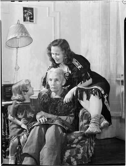 [Woman braiding a girl's hair as a younger girl holds a doll.]