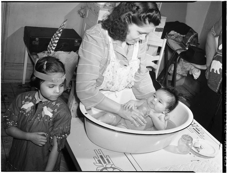 [Women giving a baby a bath as undressed children wait for their turn.]