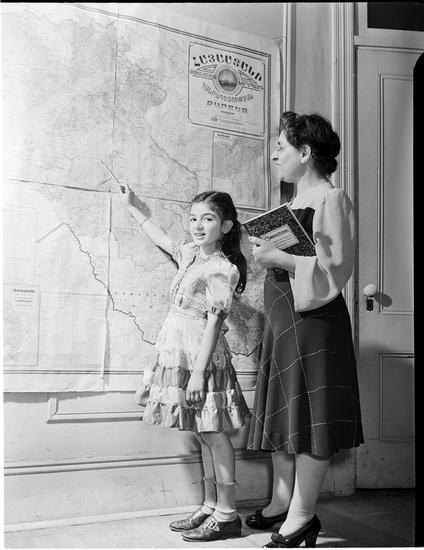 [Girl with man dressed as Santa Claus at a Christmas celebration.]