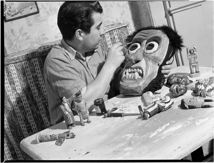 [Boy watching a man make wooden toys.]
