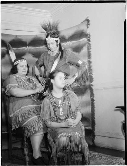 [Woman braiding a girl's hair as a younger girl holds a doll.]