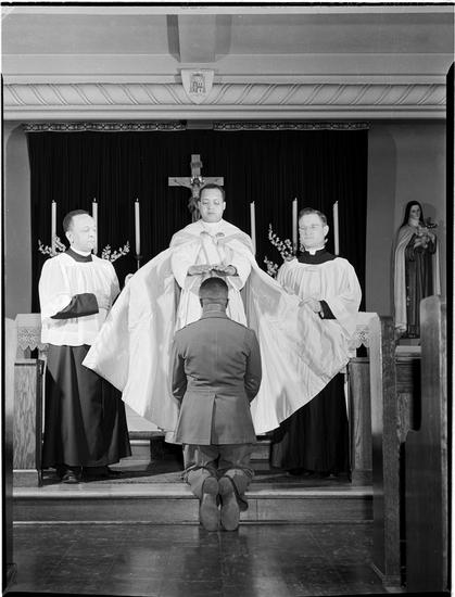 [Man kneeling before priest.]