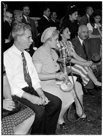 [Seated audience with a woman smoking a hookah.]