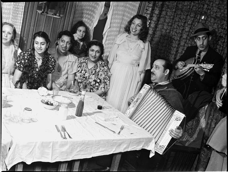 [Women showing a man and a woman cards while a man plays the accordion.]