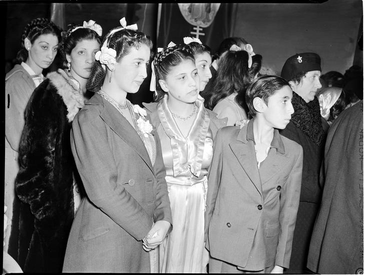 [Women at a Greek Orthodox church service.]