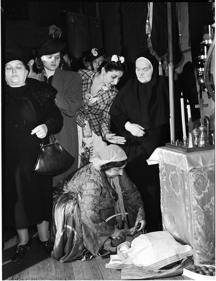 [Women at a Greek Orthodox church service.]