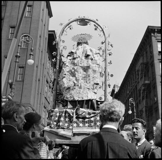 [Statue of Jesus Christ, covered with money, being carried in a religious procession.]