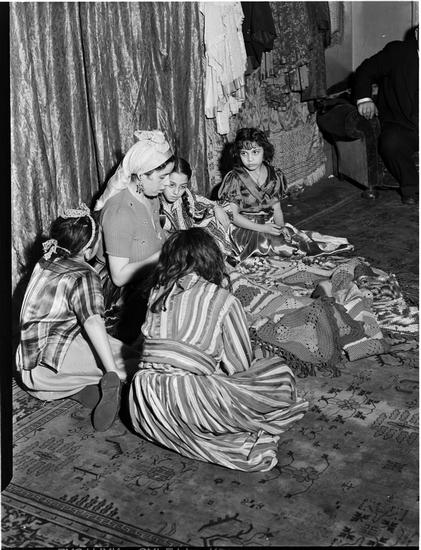[Women giving a baby a bath as undressed children wait for their turn.]