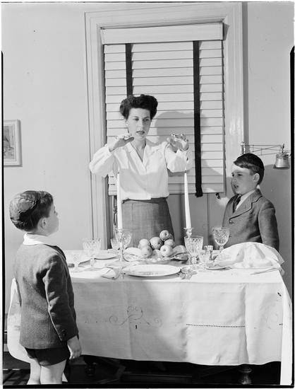 [Woman praying as her children watch.]