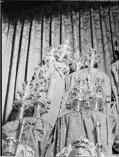 [Statue of Jesus Christ, covered with money, being carried in a religious procession.]