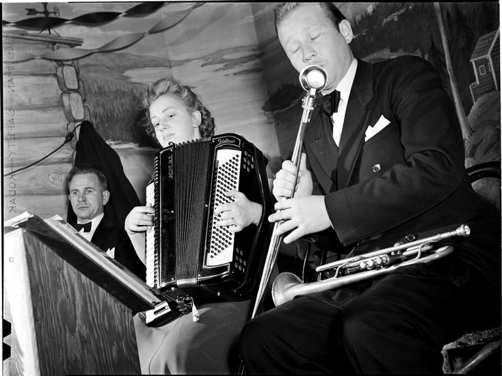 [Woman dancing as a man plays the accordion.]