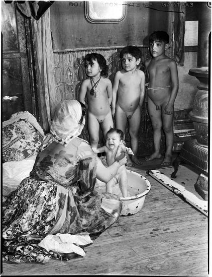 [Women giving a baby a bath as undressed children wait for their turn.]