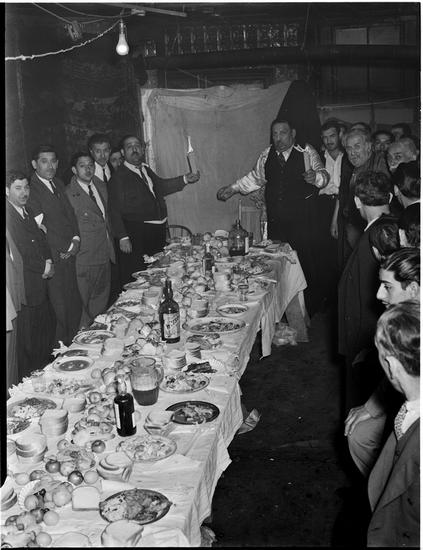 [Men at a celebratory meal.]